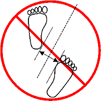 The gap between the heels is correctly measured perpendicularly to the direction of the bow stance as shown in diagram 1. Many people line up in a bow stance that is too narrow, look down at their feet, and decide that their bow stance is just right. That is because they measure the gap as shown in Diagram 2. Notice that the gap is not being measured perpendicular to the front foot. While it appears there is a gap between the heels in diagram 2, it is nonexistent if measured as shown in diagram 1. Many people make this mistake without realizing it. The stance in diagram 2 is much less stable. It is almost like walking on a tight rope!
